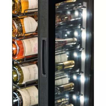 - Type de porte : vitrée, permet de visualiser facilement les bouteilles sans avoir à ouvrir la porte, ce qui réduit la circulation de l'air dans la cave et donc la variation de la température. Le traitement anti-uv protège le contenu.