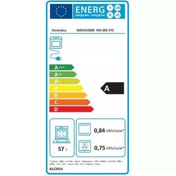 - Valeurs du label énergie : Label énergie A, Consommation en convection naturelle 0,84 kW, Consommation en chaleur tournante 0,75 kW