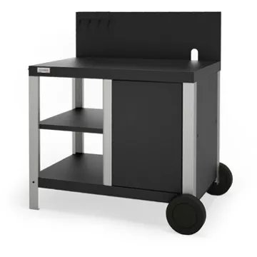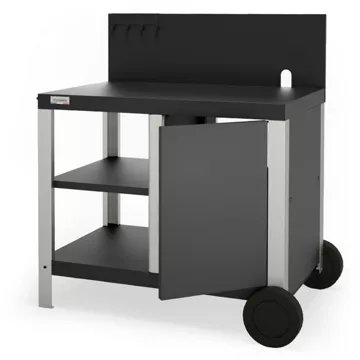 ". 1 plateau supérieur 87*54 cm. 1 Crédence haute 87*27 cm avec porte-ustensiles. 2 étagères 43*36 cm. 1 porte avec système d'ouverture " push-pull " (une simple pression déclenche l'ouverture de la porte) pour dissimuler la bouteille de gaz. 2 roues avec enjoliveurs. 1 poignée. En version ino satiné. Dimensions : L99 P64 H102 . A monter soi-même. Certification Origine France Garantie. Garantie : 5 ans"Déplacement facile sur tout type de terrain : 2 roues avec enjoliveurs et 1 poignéeLarge espace de travail : plateau supérieur 87x54 cm pouvant recevoir la plancha Allure 260 avec son couvercleEspace de rangement fonctionnel : 2 étagères, 1 espace de rangement fermé pour la bouteille de gaz et un porte-ustensiles inclus