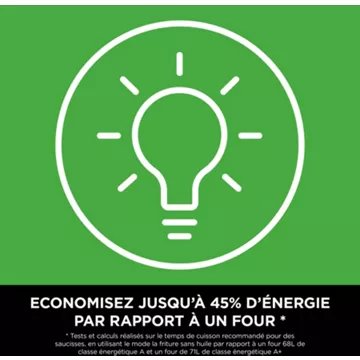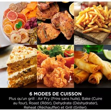 - Nombre de programmes : 6 modes de cuisson : cuire au grill, frire sans huile, cuire au four, rôtir, réchauffer, déshydrater