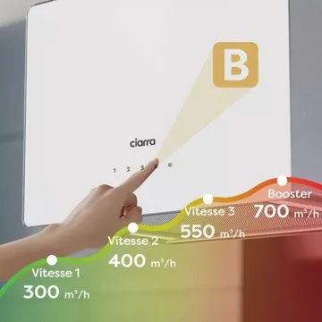 Le mode Booster permet d'augmenter le taux d'extraction de 700 m³/h, ce qui élimine rapidement et efficacement les odeurs et les fumées. Fonctionne silencieusement avec un faible niveau sonore de 44 à 64 dB pendant l'utilisation.