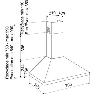 - Largeur : 70 cm, pour une zone de cuisson allant jusqu'à 70 cm de largueur.