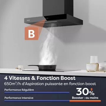 Cette hotte dispose de 4 vitesses, 3 standard et 1 intensive (booster), avec un débit maximum de 650 m3/h.