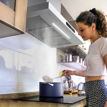 - Choisir la bonne puissance : dans une cuisine ouverte, où l'air circule dans le salon, optez toujours pour une hotte aspirante d'au moins 600 m³/h pour garantir une efficacité optimale. Pour une cuisine fermée, multipliez le volume (L x l x H) par 12 pour obtenir la capacité d'aspiration nécessaire.