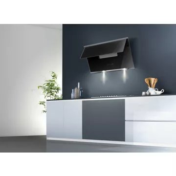 Cette hotte se distingue des autres par son design ultra moderne en verre. Équipée d'une surface d'aspiration en dessous, elle intègre également d'une deuxième surface d'aspiration en façade pour augmenter sa capacité. Cette dernière est cachée par un rabat, la rendant ainsi très discrète lorsqu'il est fermé.