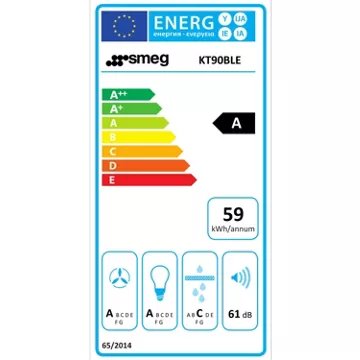 La SMEG KT90BLE ne se contente pas d'être belle, elle est également performante et respectueuse de l'environnement. Avec une classe d'efficacité énergétique A, elle assure une consommation maîtrisée de 59 kWh/an. L'éclairage LED de 1 W par lampe offre une visibilité optimale avec une température de couleur de 3000 °K, tout en étant économique. Les filtres anti-graisse en aluminium sont efficaces et faciles à entretenir, pouvant même être régénérés au lave-vaisselle. La technologie de cette hotte, associée à des matériaux de qualité comme l'acier inox AISI 304, garantit durabilité et facilité d'entretien, faisant de la SMEG KT90BLE un choix judicieux pour les amateurs de cuisine soucieux de combiner esthétique et fonctionnalité.