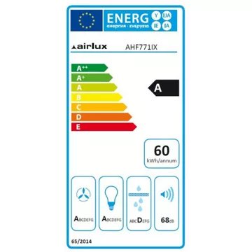 La hotte encastrable AIRLUX AHF771IIX se distingue par ses hautes performances d'aspiration, avec un débit maximum en sortie libre de 770 m³/h et en évacuation de 723,6 m³/h. Grâce à son moteur double turbine de 300 W, elle assure une évacuation efficace des fumées et des odeurs, tout en maintenant un niveau sonore modéré entre 56 et 71 dB(A). Dotée d'une classe d'efficacité énergétique A, cette hotte est conçue pour optimiser la consommation d'énergie, avec une consommation annuelle estimée à seulement 60 kWh. L'éclairage est également pensé pour l'efficacité avec des spots LED de 2 x 4 W, offrant une excellente visibilité avec une classe d'efficacité lumineuse A.