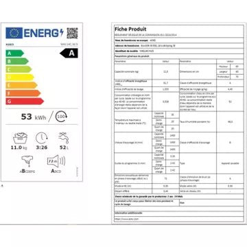 - Consommation d'électricité pour 100 cycles (programme éco) : 53,0 kW