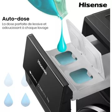 - Distributeur automatique de lessive : oui, remplissez le réservoir 1 fois pour 20 à 35 cycles. La machine adapte la consommation de produits lessiviels en fonction de la quantité de linge et de l'état de saleté.