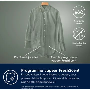 - Rafraîchissement vapeur : oui, programme dédié qui désodorise et donne une sensation de fraîcheur à votre linge