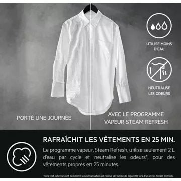 - Rafraîchissement vapeur : oui, programme dédié qui désodorise et donne une sensation de fraîcheur à votre linge