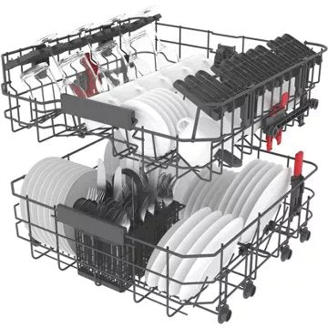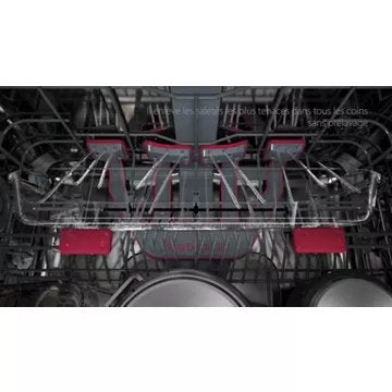 - Avantage du panier supérieur réglable en hauteur : Permet de laver des plats de grandes tailles ou de grands verres à pieds.