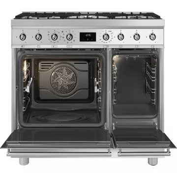 Doté de deux cavités avec des classes d'efficacité énergétique A, le SMEG C92GPX2 garantit une consommation optimisée. Le four principal offre la chaleur tournante et neuf fonctions de cuisson, dont le gril fort ventilé et l'Eco, adaptées à tous les types de plats. Le système de nettoyage par pyrolyse assure une facilité d'entretien sans équivalent. Le four secondaire, avec ses quatre fonctions traditionnelles, complète l'ensemble pour une plus grande polyvalence. Les utilisateurs bénéficient également d'une porte avec double vitrage thermo-réfléchissant pour une isolation optimale et d'un éclairage halogène pour surveiller la cuisson sans ouvrir la porte.