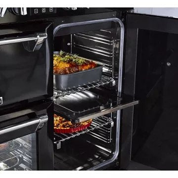 Le centre de cuisson STOVES RICHMOND DELUXE 90 DFT est doté de 2 fours et d'un maxi gril. Le maxi gril, situé en haut à gauche, est optimisé pour la cuisson des viandes. Le four de la cavité située à droite de l'appareil peut être séparé en 2 fours et est équipé d'une fonction mijotage, pain et maintien au chaud. Enfin, le troisième four électrique à chaleur ventilée comporte un volume utile de 54 litres.