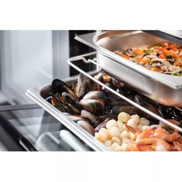 - Mode de cuisson : cuisson 100% vapeur, le four est équipé d'un générateur de vapeur. La température pendant la cuisson varie entre 40°C et 100°C, c'est pour une cuisson douce. Les arômes, les vitamines, les poissons et même la couleur de vos légumes sont préservés.