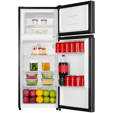 Le Réfrigérateur 2 portes HISENSE RT161D4ABE se distingue par son design élégant en couleur noire, s'intégrant parfaitement dans toute cuisine moderne. Avec un volume net total de 124 L, dont 96 L dédiés au réfrigérateur et 28 L au congélateur, cet appareil est idéal pour les petits espaces ou comme second réfrigérateur. La technologie de réfrigération statique assure une conservation homogène de vos aliments tandis que l'éclairage LED offre une visibilité optimale sans surconsommation énergétique. Les poignées intégrées et la possibilité d'inverser les portes offrent une flexibilité d'installation et d'utilisation, tandis que les pieds avant réglables et les roulettes facilitent le positionnement et le déplacement de l'appareil.