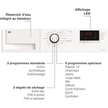 - Programmes : bébé, charge mixte, chemises, coton, délicat, jeans, sport, synthétique, prêt à repasser, prêt à porter