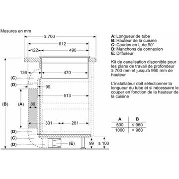 - Installation du kit recyclage sans gaine : permet une installation optimisée de votre table évitant ainsi l'utilisation de gaines et de coudes. L'extraction de l'air se fait directement dans le vide sanitaire de votre meuble.