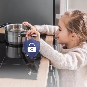 - Sécurités : arrêt automatique, coupure en cas de débordement, anti surchauffe, verrouillage du clavier, témoin de chaleur résiduelle, détection d'absence de récipient, détection de petits objets, témoin de mise sous tension