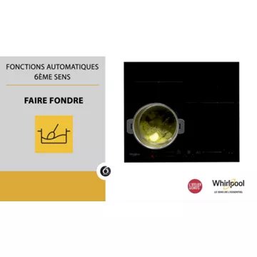 La fonction ChefControl vous permet d'obtenir 3 niveaux de températures différents. Pour cela, il vous suffit juste de glisser votre plat sur la zone FlexSide. La table à induction WHIRLPOOL WFS7560NEest équipée de la technologie 6e sens. Elle vous propose 4 fonctions préprogrammées accessibles sur les 4 foyers : bouillir, mijoter, maintien au chaud et fondre.