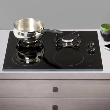 - Type de table : mixte gaz-induction, liberté d'utiliser différentes sources d'énergie pour une précision de cuisson et une montée rapide en température et fonctionnement même en cas de coupure électrique.