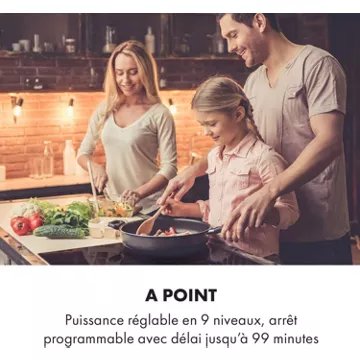 - Sécurités : arrêt automatique, anti surchauffe, verrouillage du clavier, témoin de chaleur résiduelle, détection d'absence de récipient, témoin de mise sous tension