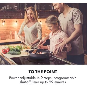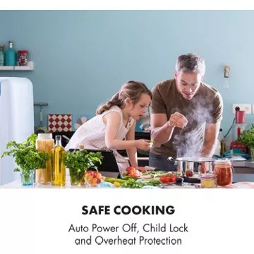 - Sécurités : arrêt automatique, anti surchauffe, verrouillage du clavier, témoin de chaleur résiduelle, détection d'absence de récipient, témoin de mise sous tension