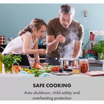 - Sécurités : arrêt automatique, anti surchauffe, verrouillage du clavier, témoin de chaleur résiduelle, détection d'absence de récipient, témoin de mise sous tension