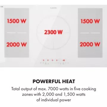 7400 watts max. sur cinq zones de cuisson 2300, 2000 ou 1500 watts de puissance