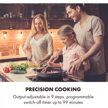 - Sécurités : arrêt automatique, anti surchauffe, verrouillage du clavier, témoin de chaleur résiduelle, détection d'absence de récipient, témoin de mise sous tension
